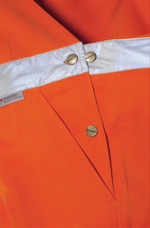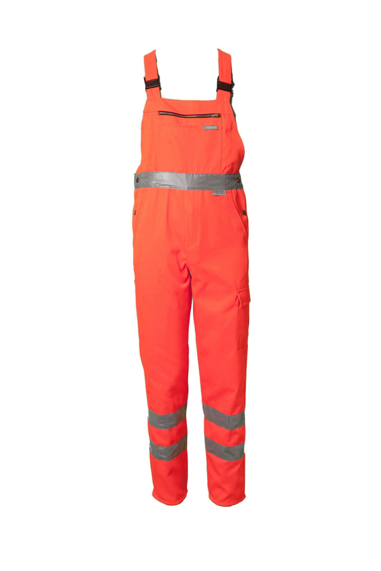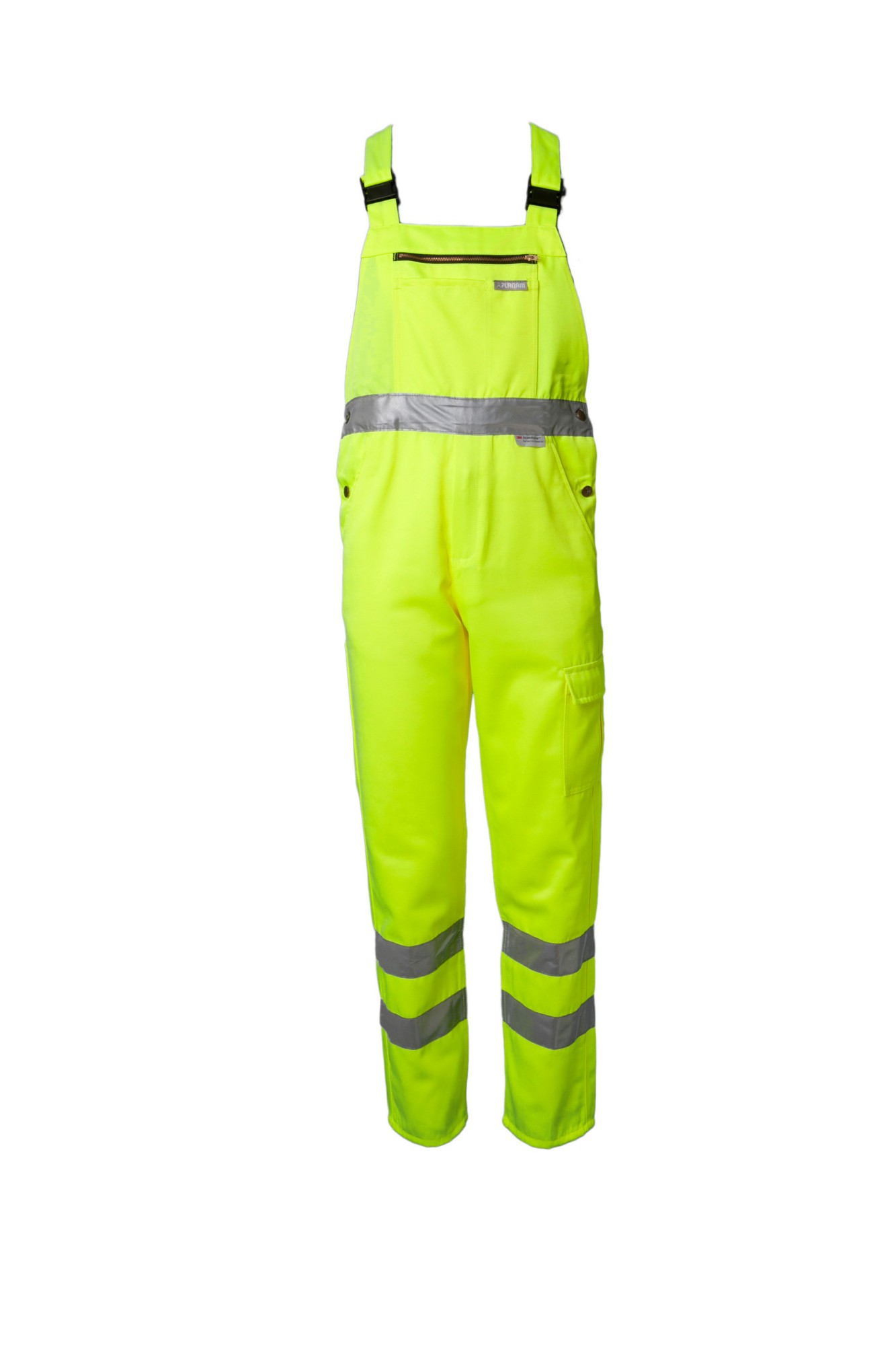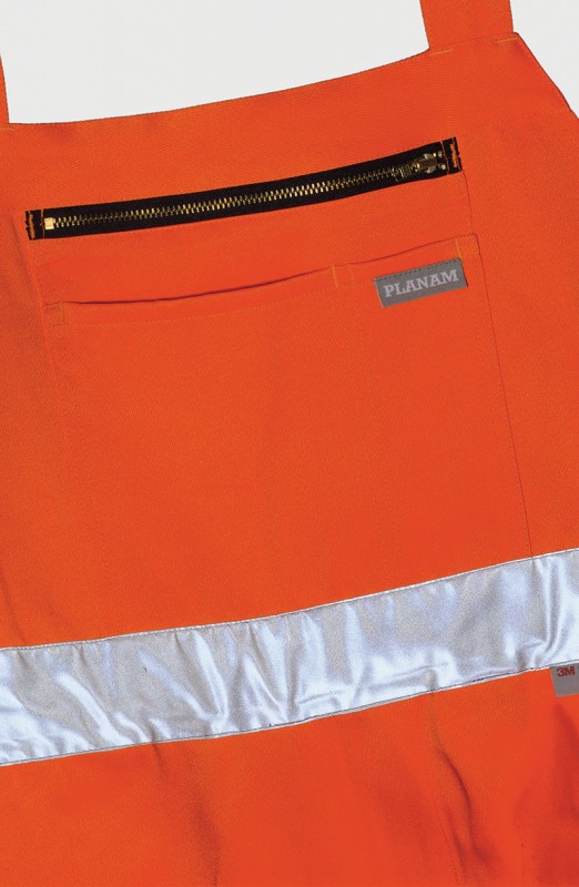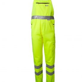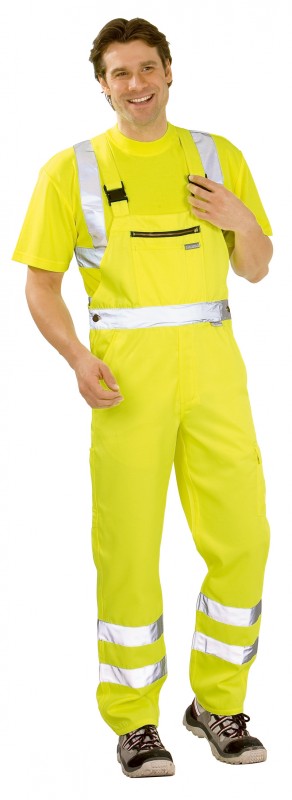 ” High Visible” Gaismu atstarojošas kombinezona bikses. 2 sānu kabatas, 1 muguras kabatas, 1 kabata darba rīkiem, 1 augšstilba kabata ar klapīti, 1 mobilā telefona kabatas, viduklis regulējams, augsta mugurpuse ar blīvi veidotu elastīgu vidukli, krūšu kabata ar rāvējslēdzi, sānus regulē ar kniedēm elastīgas plecu lences ar karabīnēm, 2 gab. 5 cm atstarojošās lentasuz bikšu starām un vidukļa.
